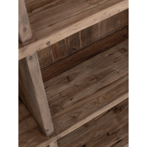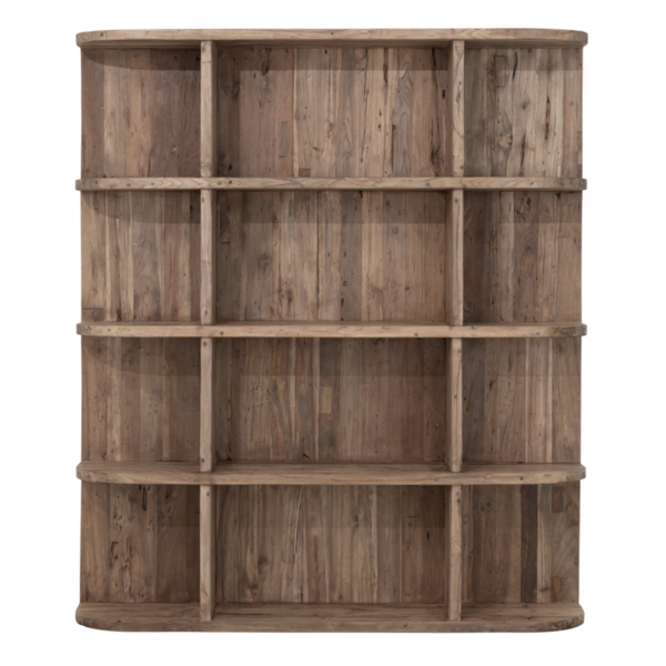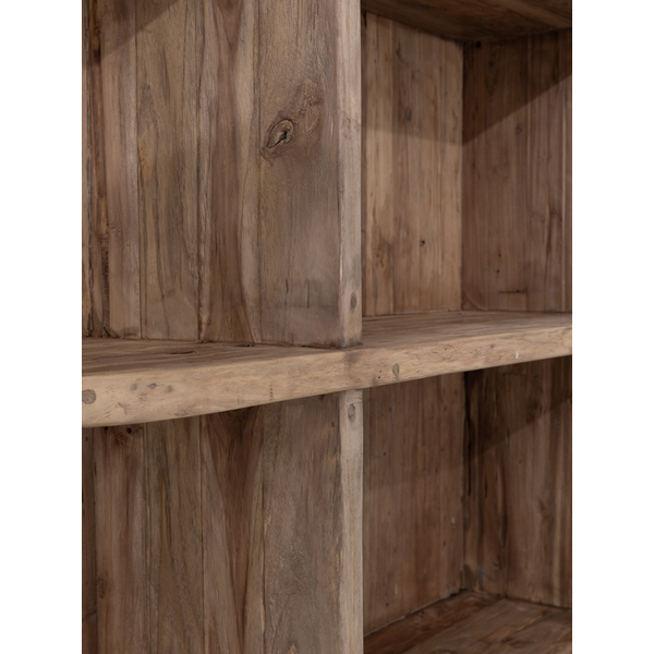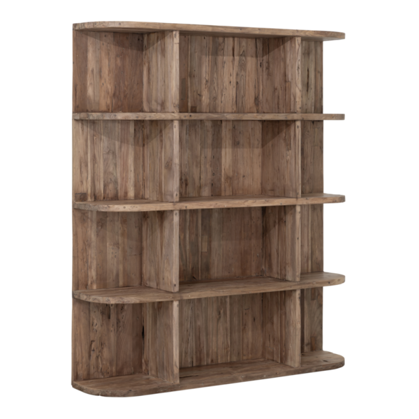 Crafted from extreme rustic teak wood, this bookcase Rush features large rounded corners and open sides. The design has no legs, and with four spacious levels, it offers a perfect balance between open display and visual calm.
