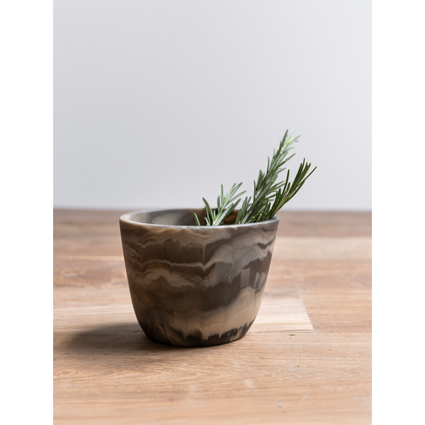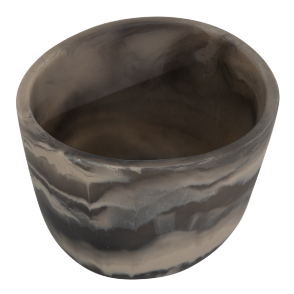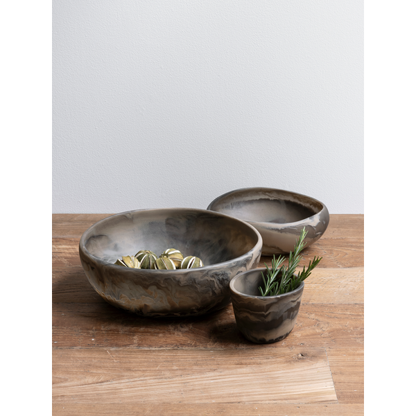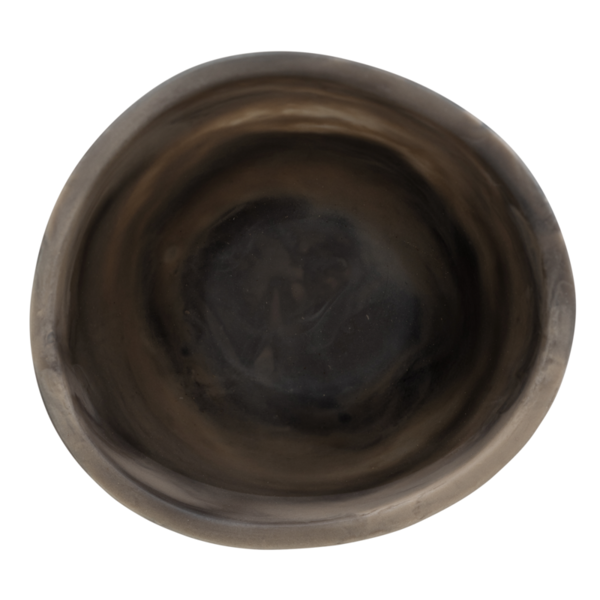 The liquid resin mixed with ground stone creates a blend that can be used to make unique objects. The result is a marble-like appearance, and each item is different, creating a playful effect on your dining table, for example.