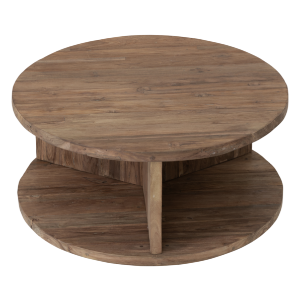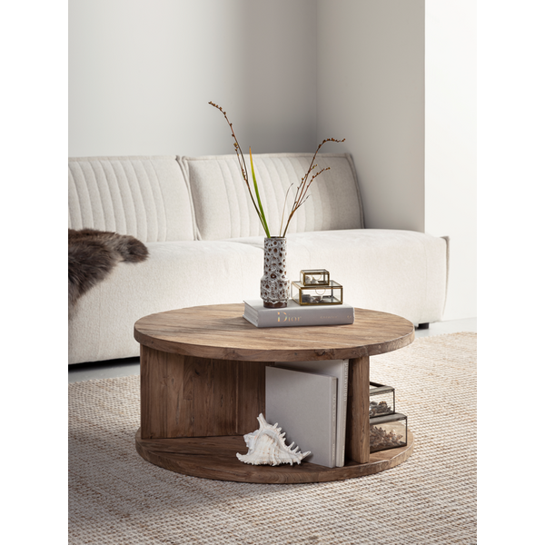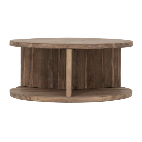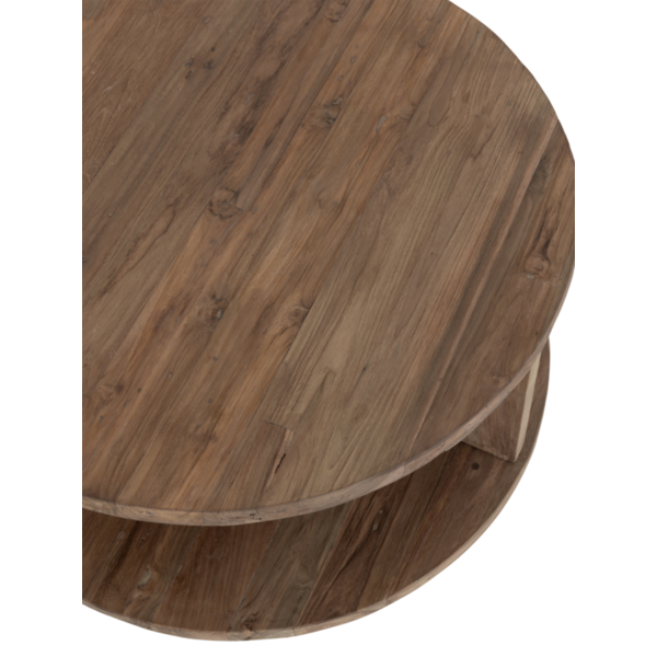 Coffee Table Rush features a circular top and base, with an open structure that reveals the character of the rustic wood from every angle. This also adds depth while maintaining a sense of openness.