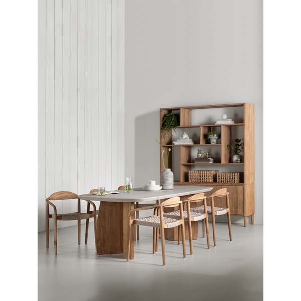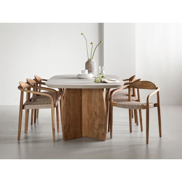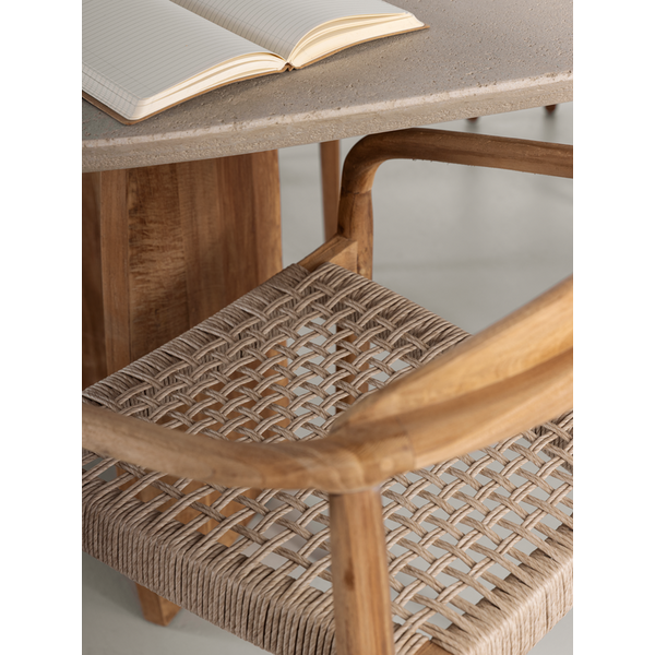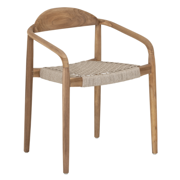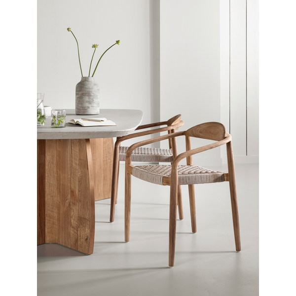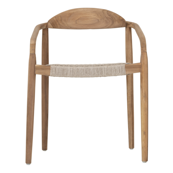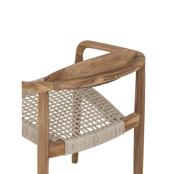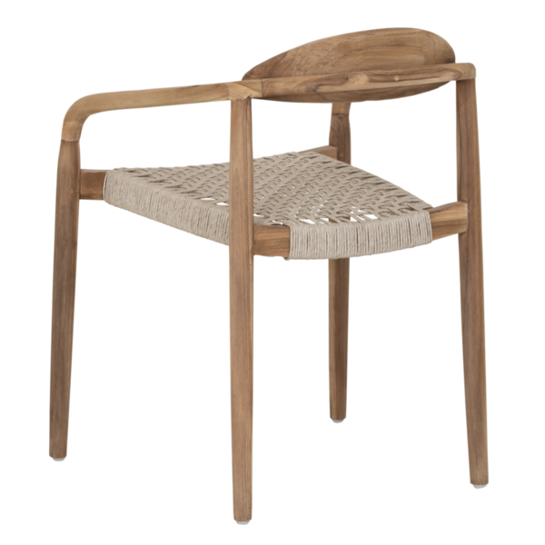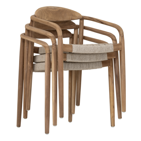 Made from rustic teakwood, dining chair Santiago combines elegant curves with natural strength for all-weather use. The seat is made from synthetic rope, offering comfort while maintaining a light and airy look. Suitable for both indoor and outdoor spaces, and stackable for easy storage.