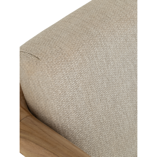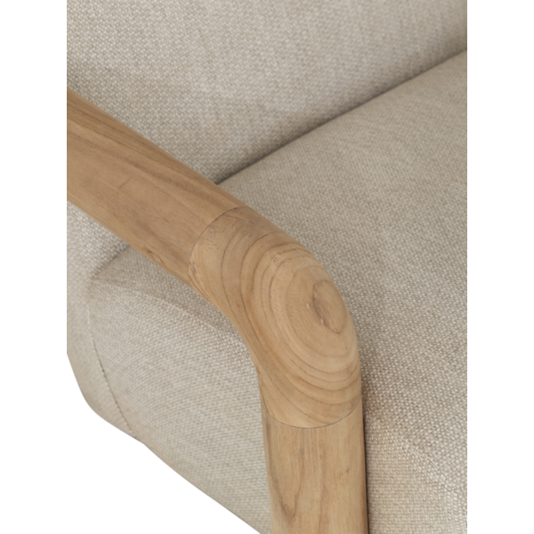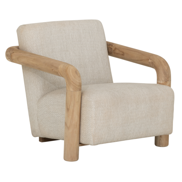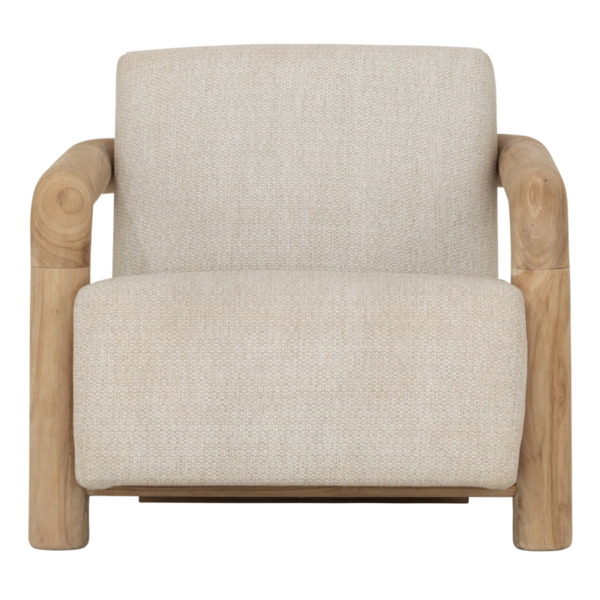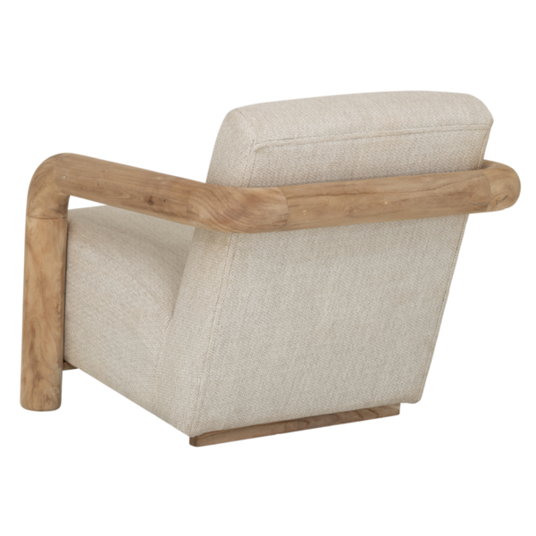 Lounge Chair Blush stands out with its bold, rounded teak frame and generous cushions. The soft upholstery combined with rustic wood makes it a cozy yet stylish choice for both indoor and outdoor spaces.